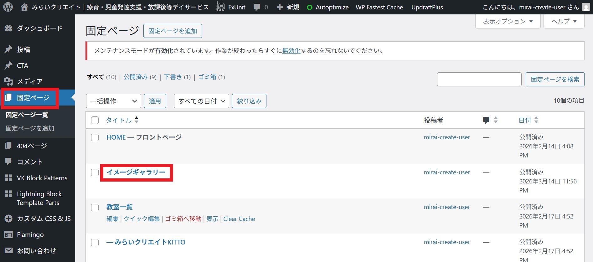 まずは、管理画面>固定ページ>イメージギャラリー をクリックし、編集画面に入ります。