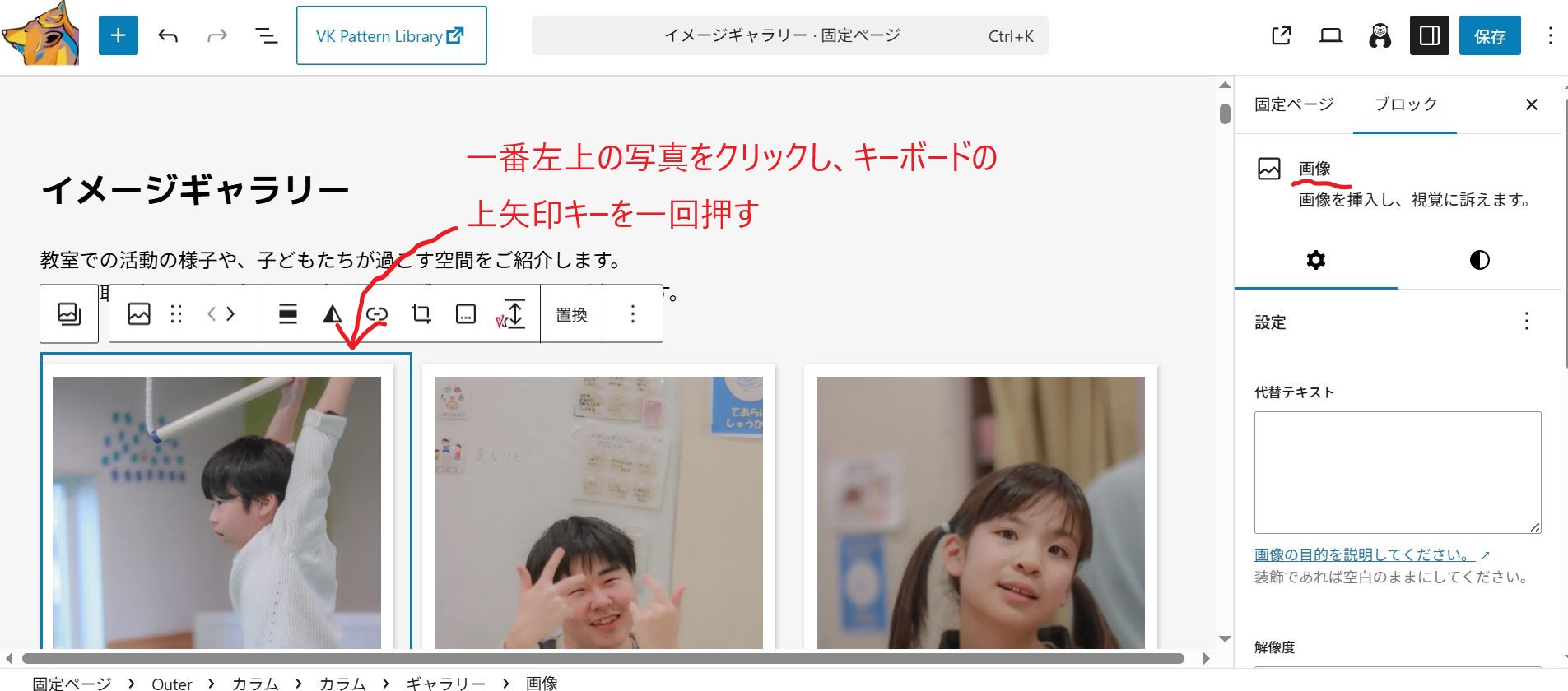編集画面にはいりましたら、ギャラリーが並んでいる一番左上の写真をクリックしてください。
